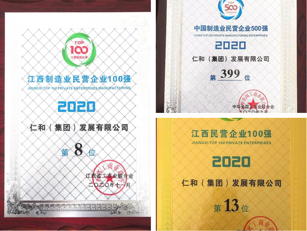 仁和集团凭借出色的发展成绩位列2020江西民营企业百强第13位、2020江西制造业民营企业第8位,并在现场获颁证书。