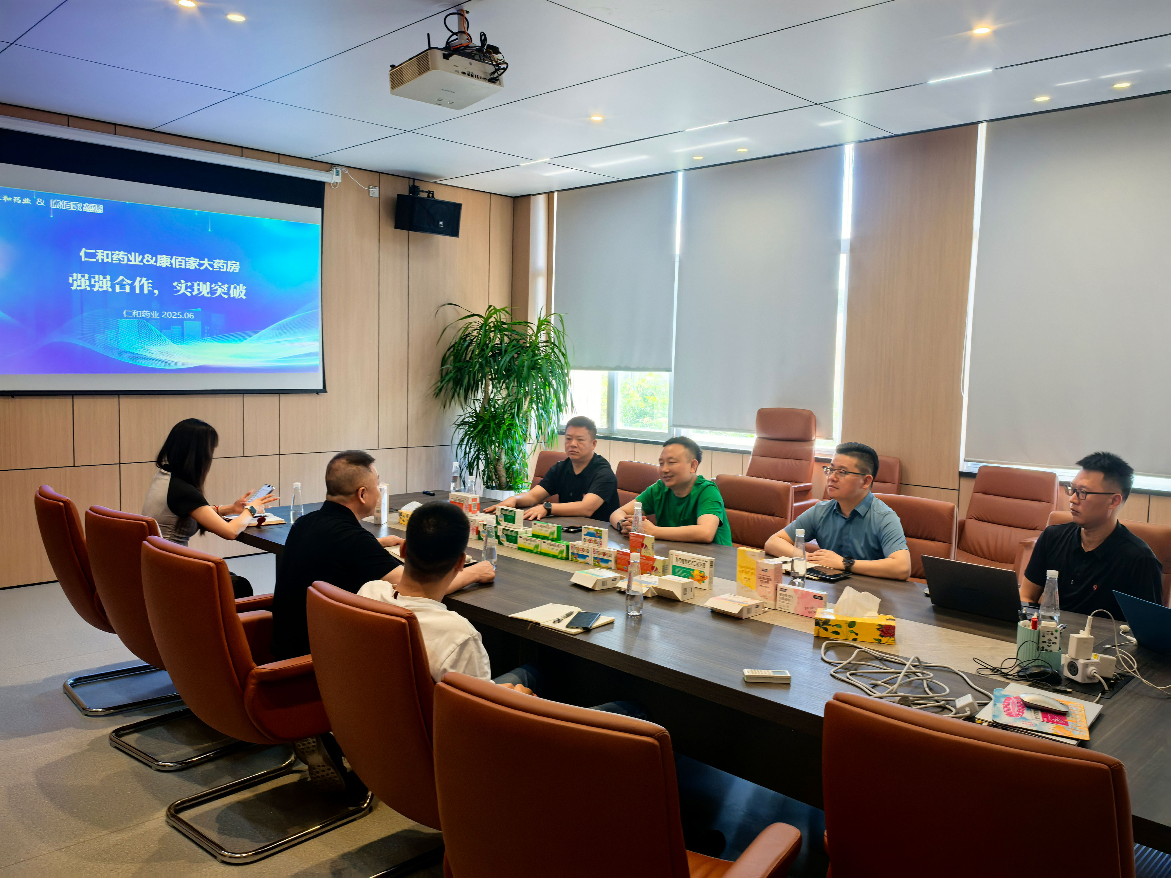 康佰家负责人王总对仁和高层来访表示欢迎,充分肯定仁和品牌实力。王总表示康佰家高度重视提升客户便利度与服务效率。双方在品牌共建,即时零售,网红爆品上达成高度共识,并就关键环节进行了高效磋商,取得积极进展。